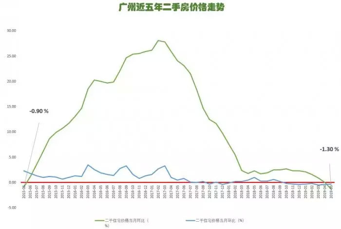 21世纪经济报道记者注意到,广州市1.3%的同比降幅,在统计局发布的70个大中城市中居首,同时也是广州二手房价自2015年5月后,四年来的首次同比下降。