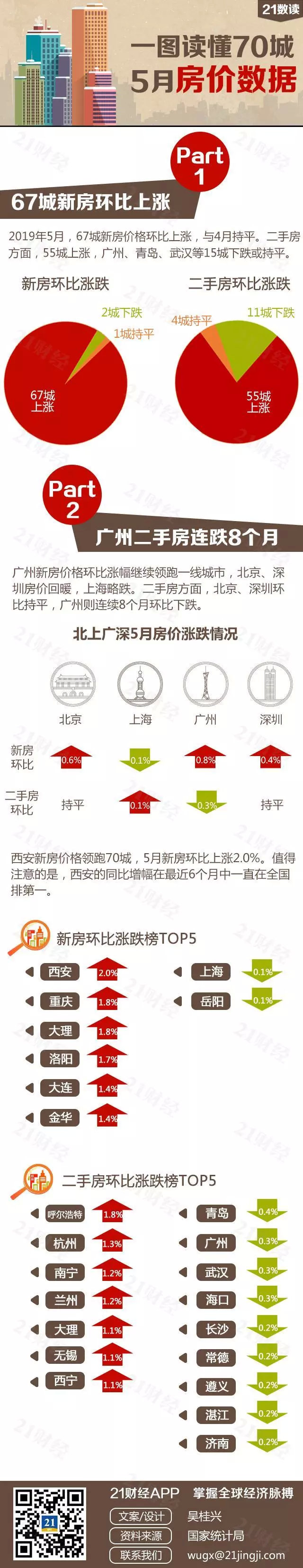 回到整体上看,5月70城房价最明显变动的数据是,二手房价格平均环比上涨0.43%,相比4月份的0.53%明显退烧。特别是一线城市二手房北京、上海涨幅持平,广州环比下调0.3%,只有上海微涨0.1%(4月份北京、上海和深圳分别上涨0.6%、0.5%和1.1%,广州下降0.4%),广州已连续两月下调。