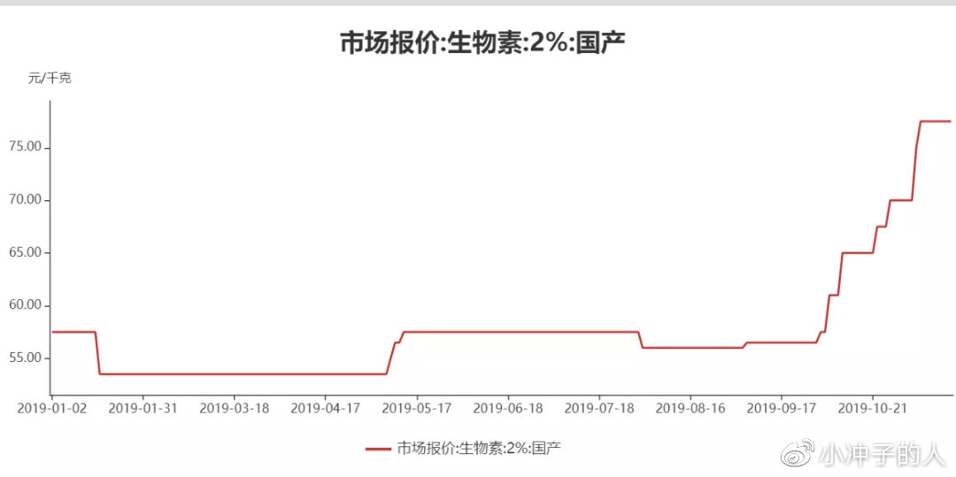 虽说产能规模不大,但却成为这一轮生物素涨价的急先锋。今年9月上旬,科兴化工提高饲料级生物素(2%纯度)至150元/公斤,提高纯品生物素纯品报价至950美元/公斤,此举引起了市场广泛关注。