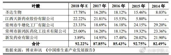 从产能来看,圣达生物和新和成具有绝对话语权。目前,圣达生物生物素纯品的年产能160吨/年,新和成生物素纯品年产能120吨。在市场占有率方面,根据博亚和讯数据预测,2018年,新和成市场占有率为28.81%,圣达生物为27.12%。而在此之前,圣达生物在生物素领域的市场占有率保持在30%左右,多年位居全球第一。