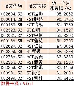 其中,*ST猛狮一个月股价接近翻倍,累计涨幅达95.29%排名第一。