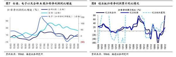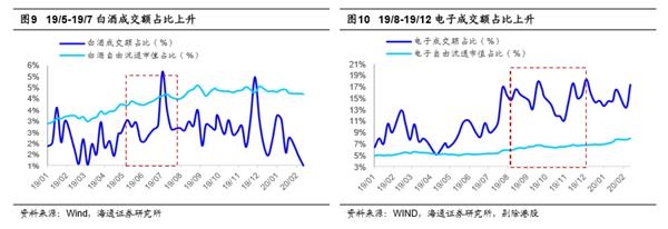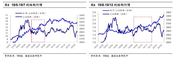 借鉴19/5-19/7、19/8-19/12,市场盘整期结构行情明显。我们认为未来市场仍需盘整蓄势,类似19/5/6-7/30和19/8/6-12/3。这两个时期上证综指始终窄幅震荡,但结构行情明显。这两次结构行情的背景都是宏观经济数据走弱,而流动性偏宽松。具体来看,在19/5/6-7/30期间,工业增加值从19年3月的8.5%回落至19年8月最低的4.4%,PMI指数从19/5-19/10均在50以下。而流动性环境偏宽松,10年期国债利率从19年4月末最高3.4%回落至19年8月中最低3%。在19/5/6-7/30期间白酒板块领涨,期间白酒指数累计涨幅11%(最大涨幅25%),远超同期上证综指涨幅-4%(最大涨幅7.4%)。这个阶段白酒板块的成交额也快速提升,白酒板块成交额占比从2.5%持续升至最高的5.2%。这个时期白酒领涨源于其盈利较好,截至2019Q2,白酒归母净利润同比(下同)增速为25.6%,ROE(TTM)为27.2%,明显高于全部A股归母净利润同比增速6.5%和ROE(TTM)9.4%。在19/8/6-12/3期间,工业增加值维持在4.4%-5.8%之间低位波动。而货币政策持续偏宽松,19年9月央行降准0.5个百分点。这段时期电子、白酒板块大涨。其中电子指数累计涨22%(最大涨幅31.8%),白酒指数累计涨12%(最大涨幅24%),远超同期上证综指涨幅2.2%(最大涨幅11%)。并且这个阶段白酒、电子板块的成交额也快速提升。白酒板块成交额占比从19/8的2.5%持续升至19/11最高的5%。电子板块成交额从19年4月的6.5%持续提升至2020年1月的17%左右。这个阶段电子板块行情同样源于其盈利明显改善,2019年电子板块扣非净利润增速从18年最低的-46.5%持续回升至19Q3的11.2%。2019Q3白酒板块盈利保持高速增长,归母净利润同比增速为22.7%。