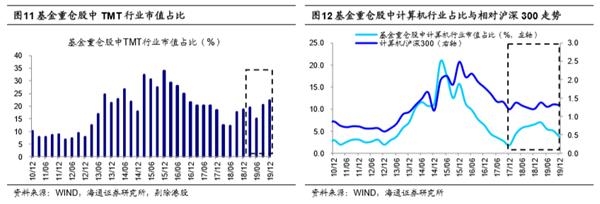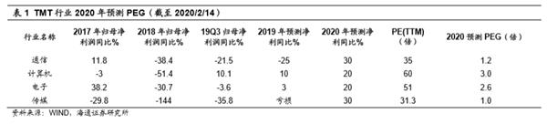 盘整期结构偏向科技。对于市场盘整期的结构性机会,投资者很关注国家针对疫情的对冲政策,有人关注基建相关的周期股。2月15日发布的国家领导人在中央政治局会议的讲话中提出要推动重大项目开工建设,19年12月以来财政部共计提前下达新增地方政府债务限额约1.8万亿元。我们回顾2019年,地方专项债约2.15万亿,其中约70%是投入棚改和土地储备,仅25%左右用于基建投资。根据海通宏观测算,预计2020年新增专项债额度或提升至3.3万亿左右,其中34%~38%用于基建投资,预计2020年基建投资增速(旧口径)或回升至8%~9%左右。基建增速只是温和回升,周期股的需求会回升,但弹性恐怕一般。我们认为市场盘整期科技类行业更优,2月15日国家领导人的讲话中,也提出要“加快释放新兴消费潜力,积极丰富5G技术应用场景,积极稳定汽车等传统大宗消费”,鼓励新兴消费的政策导向同样有利于5G产业链、计算机、新能源汽车等科技类行业的发展。也有部分投资者担忧目前科技板块有过热的风险。从基金仓位来看,19Q4基金重仓股(剔除港股)中TMT市值占比环比上升1.9个百分点至22.4%,略高于2013年以来的均值21.8%,目前处于14Q1水平,整体来看并不高,详见《科技和周期占比上升——基金2019年四季报点评-20200121》。并且从PEG角度来看TMT板块估值也并不高,由于2019年部分TMT板块整体净利润增速为负,所以这里用行业2020年的板块预测净利润计算动态PEG水平,目前TMT行业2020年预测PEG基本在1-3倍之间,具体电子板块为(2.6倍)、计算机(3倍)、通信(1.2倍)、传媒(1倍)(详见表1)。另外从新发基金规模来看,19年12月以来新发行的股票型和偏股型基金共71只,总规模约1397亿。从基金名称以及基金经理风格判断,其中偏科技成长类风格的基金有22只,总规模428亿左右(占比31%)。其余的主要是综合性以及其他风格的基金,从这个角度看,未来科技股弹药充足。并且拉长时间看,着眼整个牛市3浪,最终还是利润增速快的行业涨幅更大,我们认为这次牛市的主导产业是科技+券商,科技行情是中期趋势。从政策角度看,产业政策支持、中美争端引发的国产替代、金融领域鼓励直接融资有助于新兴产业发展。从技术周期角度看,当前正处在5G引领的新一轮科技周期中,借鉴2012-15年历史经验,科技股行情往往会扩散,从硬件到内容到软件到应用场景,科技行业包括TMT和新能源车。