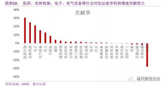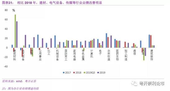 在创业板中,2019年业绩增速提升的行业主要包括建筑材料、电气设备、传媒、公用事业、化工、机械设备、国防军工、家电、有色、计算机、电子、农林牧渔。