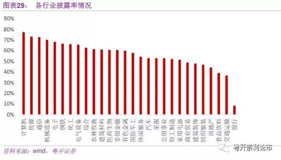 目前在申万28各一级行业中,披露率最高的行业是计算机,披露率达77%以上,披露率前五的行业集中在TMT领域,披露率排名前五的行业分别为计算机(77.53%)、传媒(73.37%)、通信(72.82%)、机械设备(70.34%)、电子(68.34%)。披露率在60%以上的有14个行业,披露率在50%以上的有21个行业。披露率最低的行业是银行业,仅三家银行披露,披露率不足10%,披露率最低的五个行业是银行(8.33%)、交运、(36.75%)、食品饮料(39.18%)、房地产(44.36%)、纺服(46.99%)。