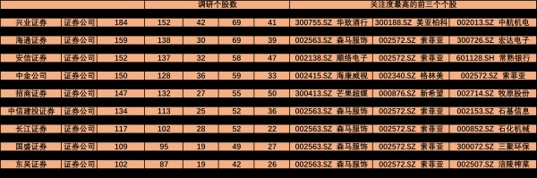 数据显示,今年三季度共计有179家券商机构进行了4881次上市公司调研。其中,兴业证券、中信证券、海通证券、国泰君安、安信证券、广发证券等18家券商三季度调研总次数超过100次。森马服饰(002563.SZ)、索菲亚(002572.SZ)成为这18家券商关注度较高的上市公司。