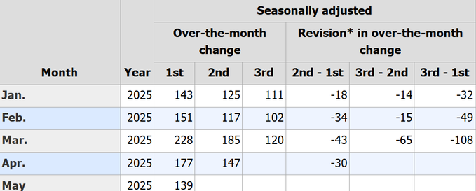 事实上,记者早在6月下旬就对美国经济数据的可信度进行过探讨。当时记者曾注意到今年上半年非农数据中一个很有意思的现象:几乎每次非农数据发布后,都会被进一步下修(如下图所示)……按惯例,美国劳工部在非农当天公布最初的当月新增就业数据后,接下来两个月还会对数据先后进行两次修正。