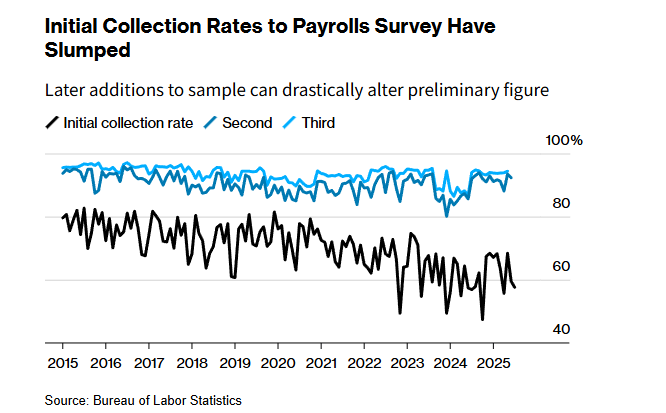 此外,数据的修正也指向着另一个问题:调查的低应答率。在统计历月非农数据的第一次调查中,参与回复企业的比例越来越少。近几个月来,初次收集率已多次降至60%以下——远低于疫情前大约70%或更多的正常水平。