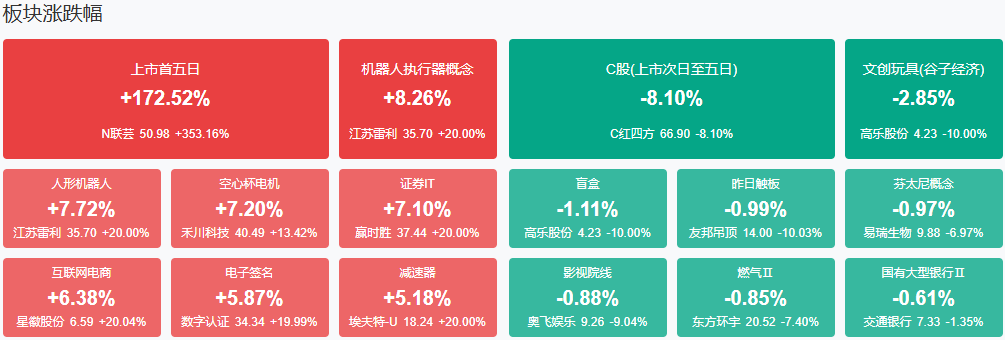 板块方面,机器人、电商、互联网金融、食品加工等板块涨幅居前,燃气、影视、IP经济、机场等板块跌幅居前。