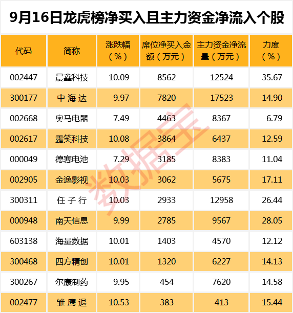 证券时报•数据宝统计显示,9月16日龙虎榜中机构及营业部席位资金净卖出0.01亿元,其中净买入的个股有14只;净卖出的个股有13只。净买入前三名个股分别是晨鑫科技、中海达、奥马电器等,净买入金额占当日成交额比例达24.39%、6.65%、3.62%。