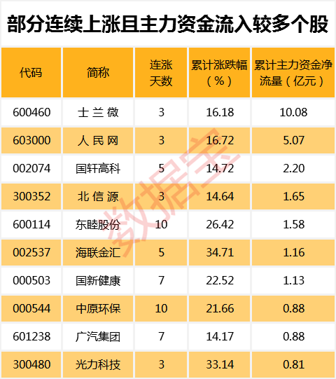 值得注意的是,200只连续上涨个股中,7只个股期间主力资金累计净流入超过亿元。其中,累计资金流入最多的为士兰微,主力资金累计流入10.08亿元。