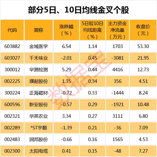从个股走势来看,有13只A股的5日均线主动上穿10日均线,其中金域医学、千禾味业、华测检测等个股的5日均线较10日均线距离最大,分别达1.14%、0.45%、0.44%。