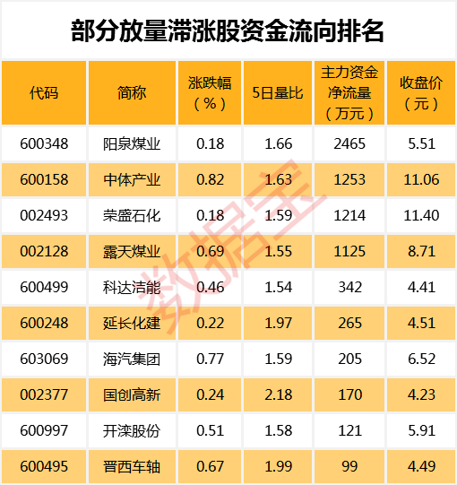 值得注意的是,39只放量滞涨股中,阳泉煤业、中体产业、荣盛石化、露天煤业、科达洁能等个股主力资金净流入较多。