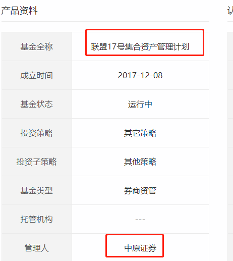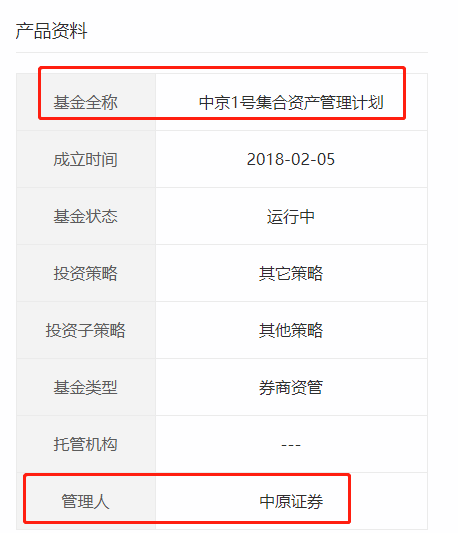 上面显示,中原证券资管在2017年12月设立了资管产品“联盟17号”,在2018年2月设立了“中京1号”,两者各自募集了5984万元、18165万元,合计募集资金2.4亿。