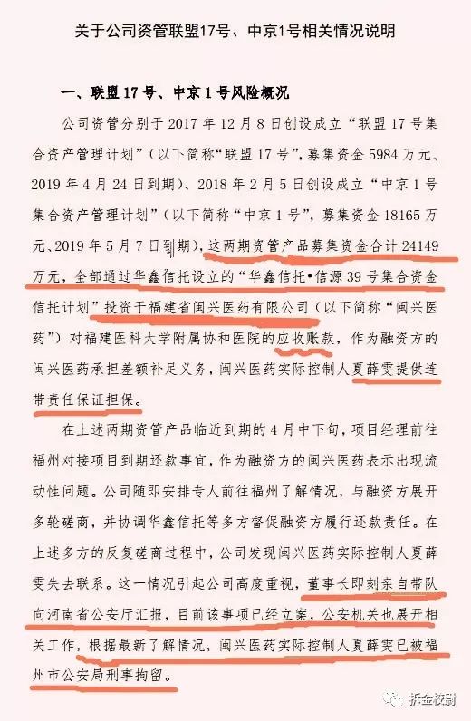 原来是投资到福建闽兴医药公司对福建医科大学附属协和医院的应收账款,作为融资方的闽兴医药承担差额补足义务,实控人夏薛雯提供连带责任保证担保。