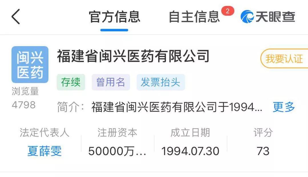 公开资料显示,福建省闽兴医药有限公司于1994年7月30日在福建省工商行政管理局登记成立。法定代表人夏薛雯,公司经营范围包括中药、西药、医疗用品及器材、化工产品(不含危险化学品及易制毒化学品)等。