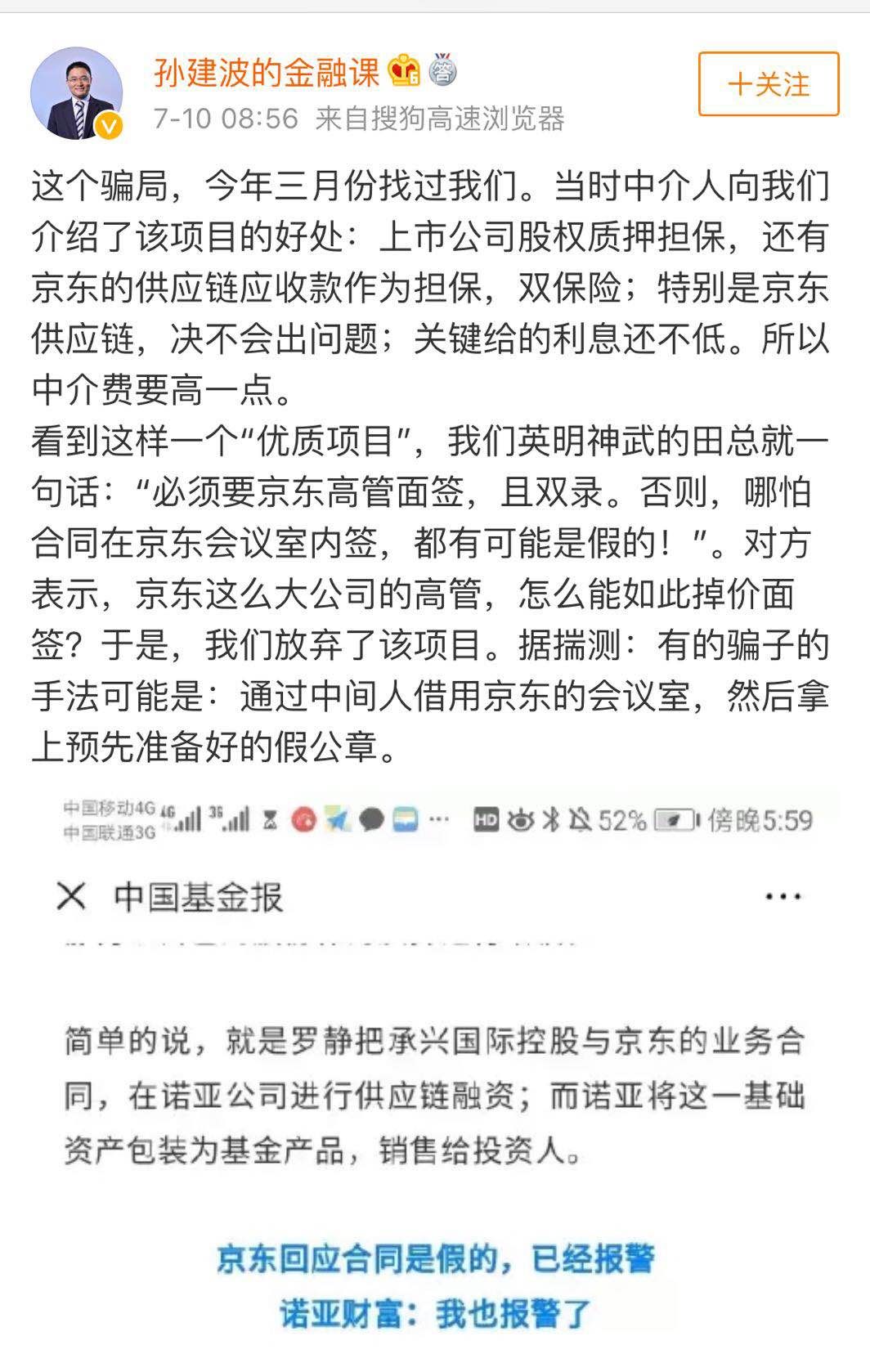 中阅资本总经理孙建波就表示,这个骗局(诺亚踩雷事件),今年3月份曾找过其所在公司。当时中介人介绍了该项目的好处:上市公司股权质押担保,还有京东的供应链应收款作为担保,双保险;特别是京东供应链,不会出问题;关键给的利息还不低。所以中介费要高一点。