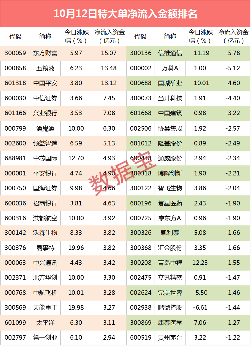 两市有66股大单资金流入超亿元。东方财富流入居首,净流入15.07亿元。券商板块早盘较为强势,国海证券涨停,消息面上,上周五国务院发布《关于进一步提高上市公司质量的意见》,利好资本市场。资金面上,中信证券大单资金流入7.45亿元,国海证券、太平洋、第一创业等个股流入均超2亿元。保险板块早盘也领涨市场,中国平安今日大单资金流入超13亿元。