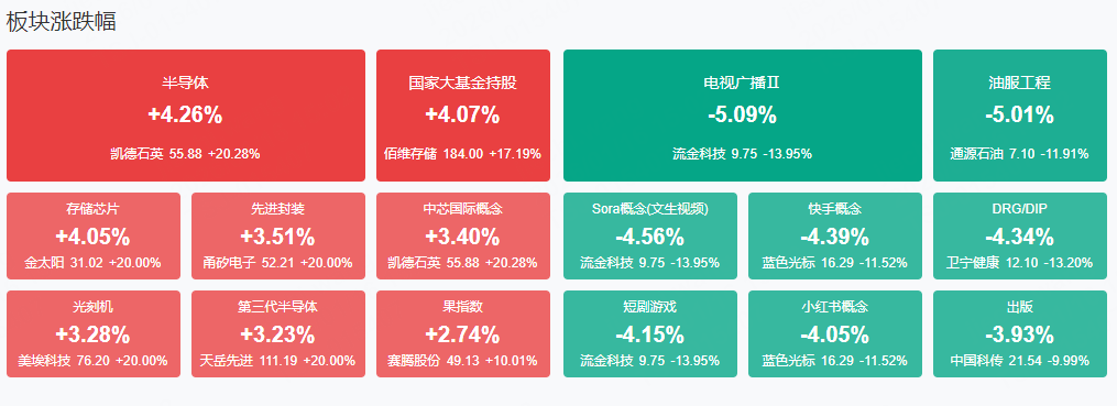 板块题材上,半导体、存储芯片、机器人、智能电网等板块表现活跃,AI应用、锂电池等板块表现落后。截至收盘,沪指跌0.26%,深成指跌0.18%,创业板指跌0.2%。