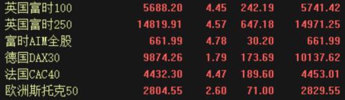 欧洲股市方面,周三英国富时100指数涨4.45%,德国DAX30指数上涨1.79%,法国CAC40指数上涨4.47%,欧洲斯托克50指数上涨2.60%。