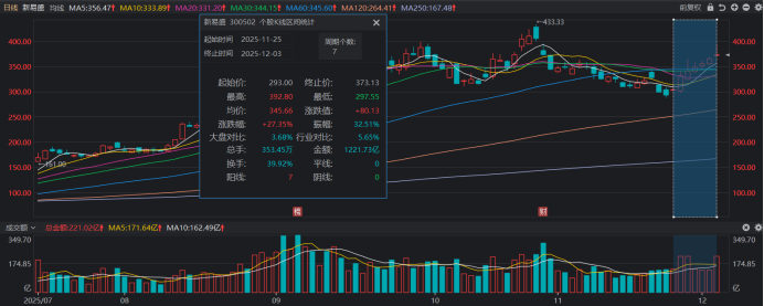 作为CPO板块核心热股,新易盛的市场关注度一直保持较高水平。从量能数据上看,其此次7连涨行情期间(11月25日至12月3日)日均成交额近174.53亿元,在整个A股市场中位居第二位,仅次于同为CPO龙头股的中际旭创(212.82亿元)。其中,新易盛今日全天成交额达221.02亿元,创10月30日以来近1个月新高。