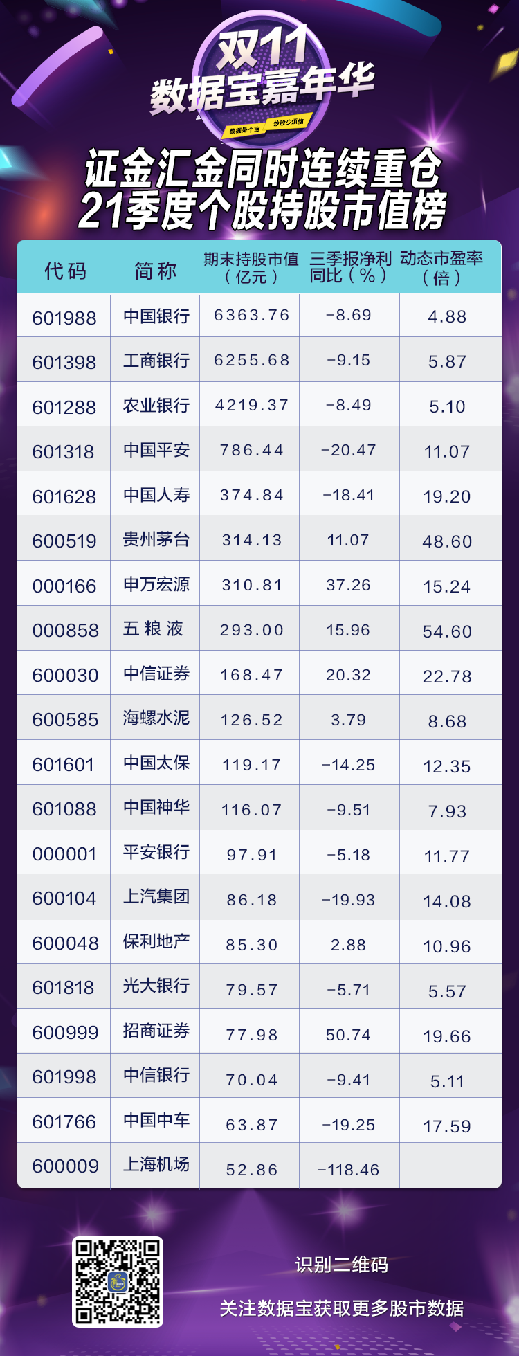 证金汇金同时连续21季重仓股揭秘