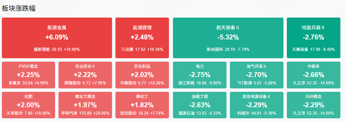 市场探底回升,三大指数午后跌幅收窄,创业板指此前一度跌超2.5%。沪深两市成交额2.64万亿,较上一个交易日缩量1626亿。盘面上,市场热点较为杂乱,全市场超3300只个股下跌。从板块来看,锂矿概念集体爆发,盛新锂能、金圆股份、融捷股份、江特电机、西藏珠峰涨停,天齐锂业触及涨停。芯片产业链震荡拉升,综艺股份2连板,富瀚微20cm涨停,华虹公司、杰华特涨超10%。化工板块表现活跃,广信股份、江南高纤、天禾股份、三房巷涨停。下跌方面,商业航天概念持续调整,西部材料跌停,久之洋、中衡设计、广联航空、通宇通讯、上海港湾等多股跌幅靠前。算力硬件方向走弱,新易盛、天孚通信、剑桥科技纷纷下挫。