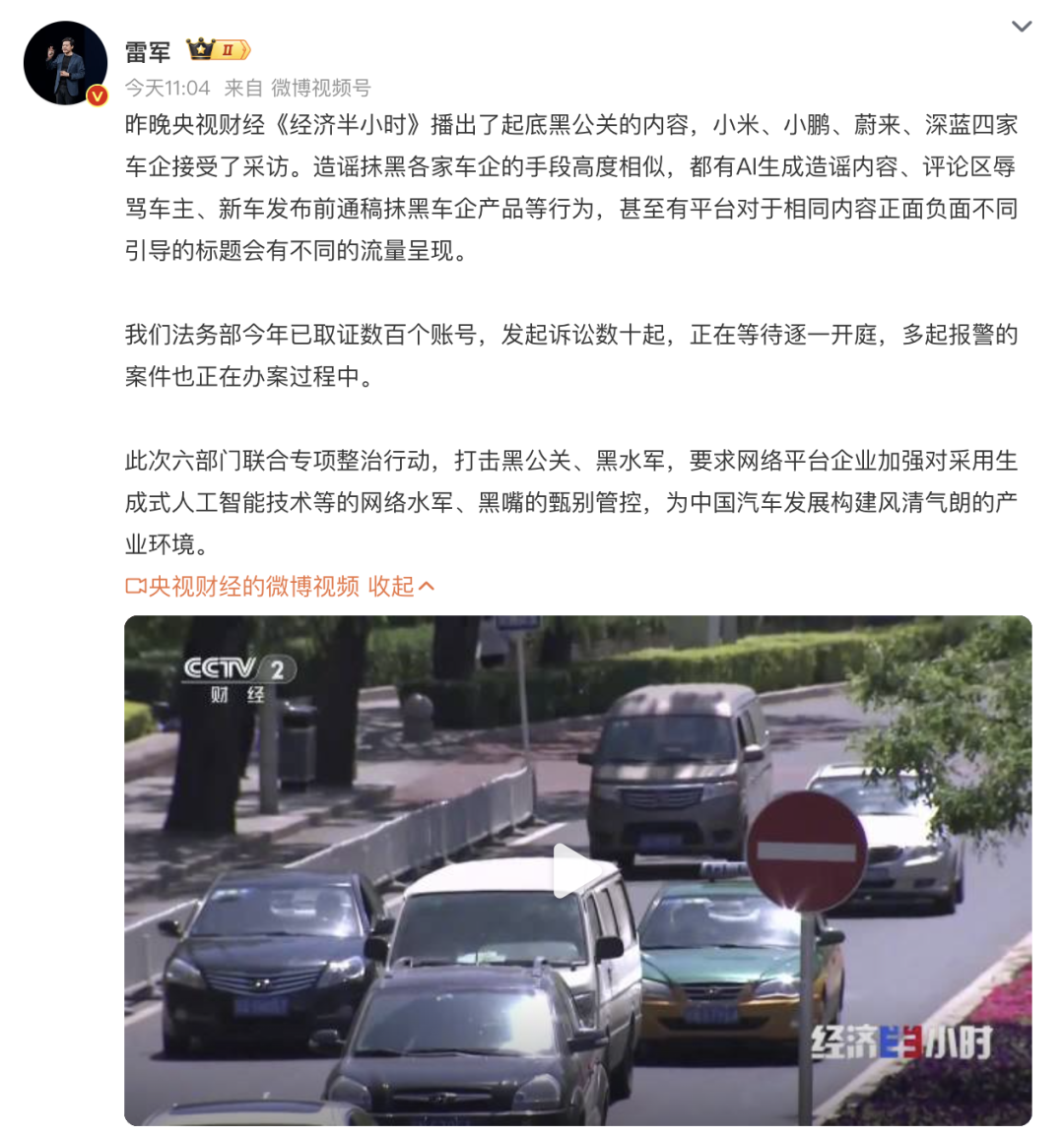 雷军:已取证数百个汽车黑公关账号,发起诉讼数十起