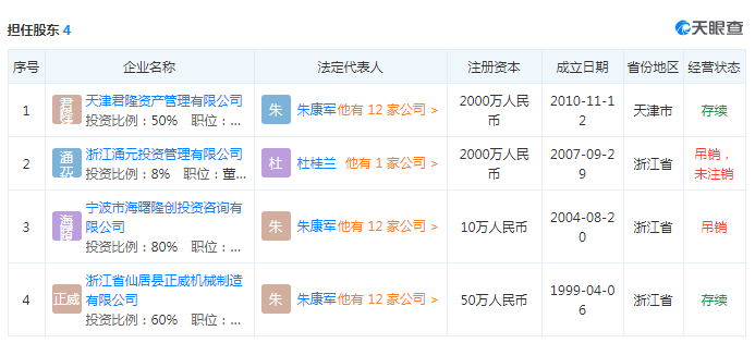 如今天眼查显示,他还在2家存续公司担任股东:一家名为天津君隆资产管理有限公司,资料显示,该公司成立于2010年11月,是一家由天津国际阳光资本管理有限公司作为主发起人,和管理团队出资设立的证券类私募基金的管理公司。