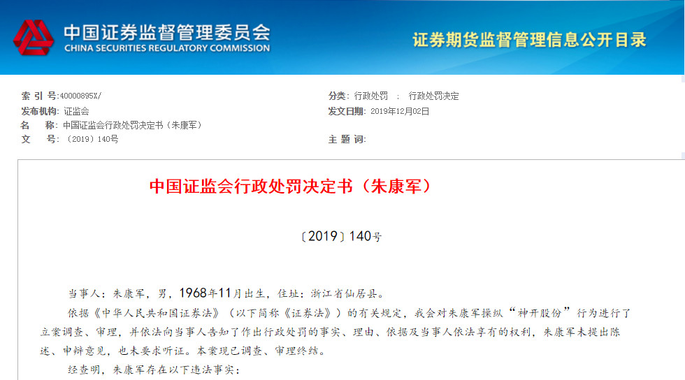 处罚书表示,根据当事人违法行为的事实、性质、情节与社会危害程度,依据《证券法》第二百零三条的规定,我会决定:对朱康军处以300万元的罚款。
