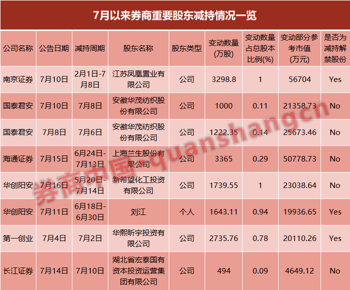此外,华安证券东方财富等上市券商也陆续挂出控股股东(5%以上股东)减持股份的预披露公告,提前透露减持意愿。例如,7月14日下午,华安证券披露信息显示,其持股8.18%股东安徽出版集团预计减持不超过2000万股,减持比例不超过0.55%。东方财富股东则因“个人需求”,预计减持1.61亿股,减持比例不超过2%。