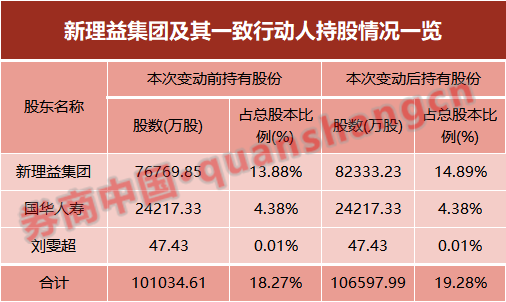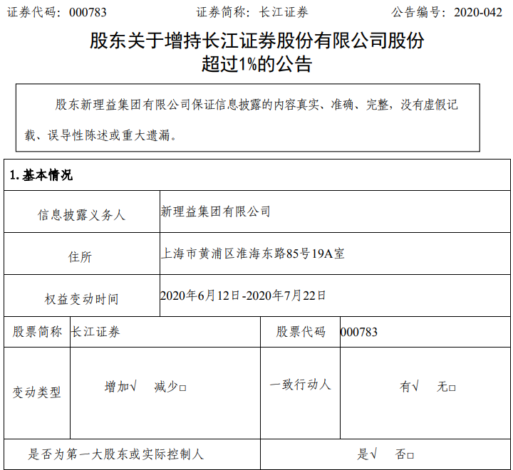 7月23日晚间,长江证券发布股东增持超过1%的公告。6月12日-7月22日,长江证券第一大股东新理益集团通过交易所集中交易的方式增持5563.28万股,增持比例1.01%,资金来源系自有资金。在变动完成后,新理益集团及2名一致行动人合计持有长江证券股份达到19.28%。