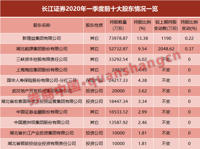 进入2020年以来,长江证券的股权变化更为明显,各个派系股东均有增减持动作。2020年一季报显示,刘益谦派系的新理益和三峡系的湖北能源分别增持1190万股和2048.62万股,增持比例分别达到0.22%和0.37%。