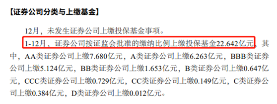 根据保护基金公司今年2月17日发布的统计数据,2019年1-12月,证券公司按证监会批准的缴纳比例上缴投保基金22.642亿元,其中,AA类证券公司上缴7.680亿元,A类证券公司上缴6.263亿元,BBB类证券公司上缴5.124亿元,BB类证券公司上缴1.653亿元,B类证券公司上缴0.647亿元,CCC类证券公司上缴0.729亿元,CC类证券公司上缴0.149亿元,C类证券公司上缴0.384亿元,D类证券公司上缴0.012亿元。