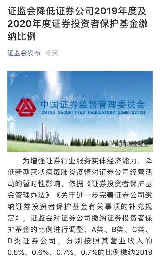 3月6日晚间,证监会发布公告表示,为增强证券行业服务实体经济能力,降低新型冠状病毒肺炎疫情对证券公司经营活动的暂时性影响,依据《证券投资者保护基金管理办法》《关于进一步完善证券公司缴纳证券投资者保护基金有关事项的补充规定》,证监会对证券公司缴纳证券投资者保护基金的比例进行调整,A类、B类、C类、D类证券公司,分别按照其营业收入的0.5%、0.6%、0.7%、0.7%的比例缴纳2019年度证券投资者保护基金,2020年度证券投资者保护基金的缴纳比例参照执行。