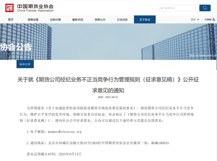 8月1日,中国期货业协会(下称中期协)发布公告称,就《期货公司经纪业务不正当竞争行为管理规则(征求意见稿)》(下称《规则》)公开征求意见。本次意见反馈截止时间为2025年8月15日。