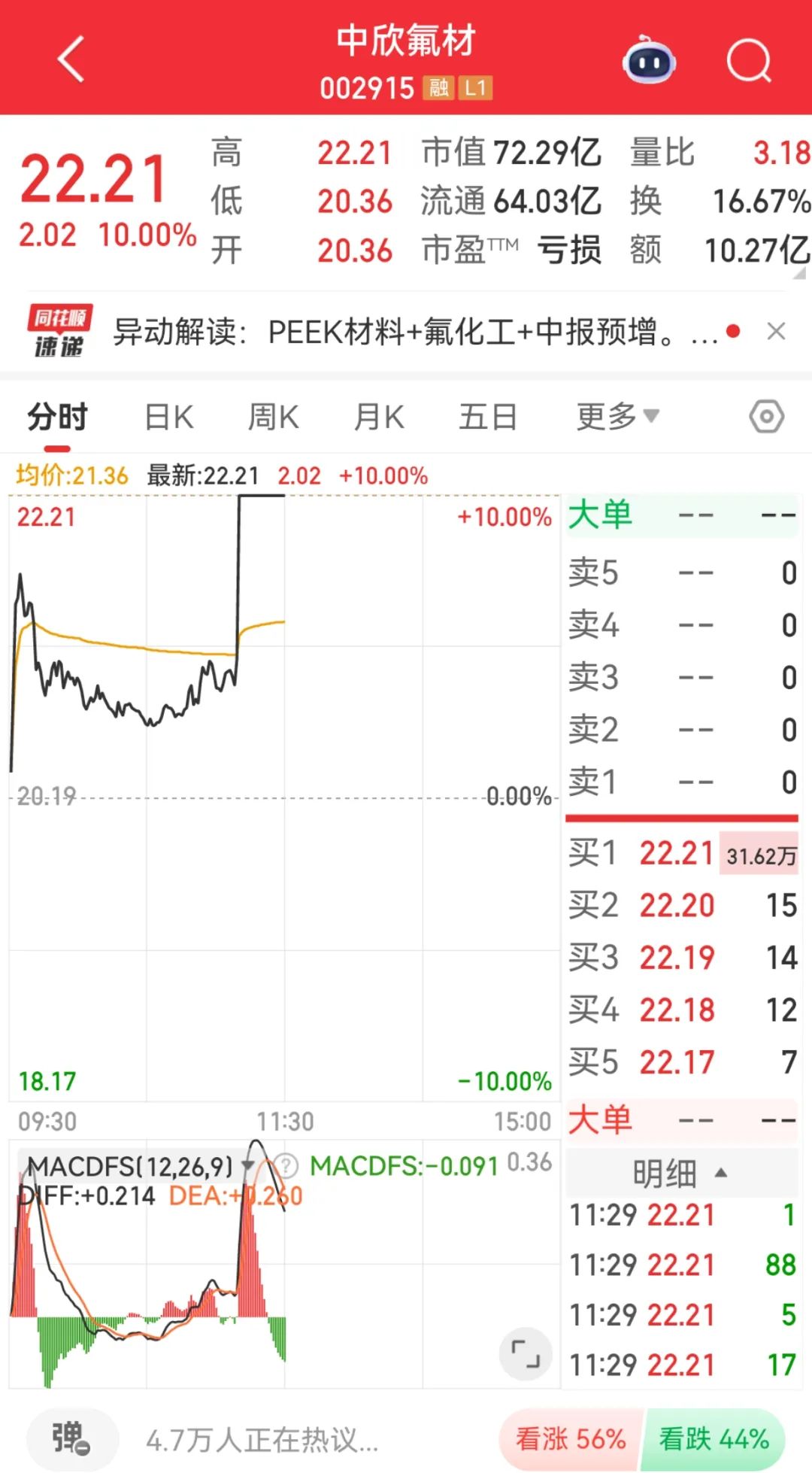 今天上午,PEEK材料概念股上涨,中欣氟材强势涨停。