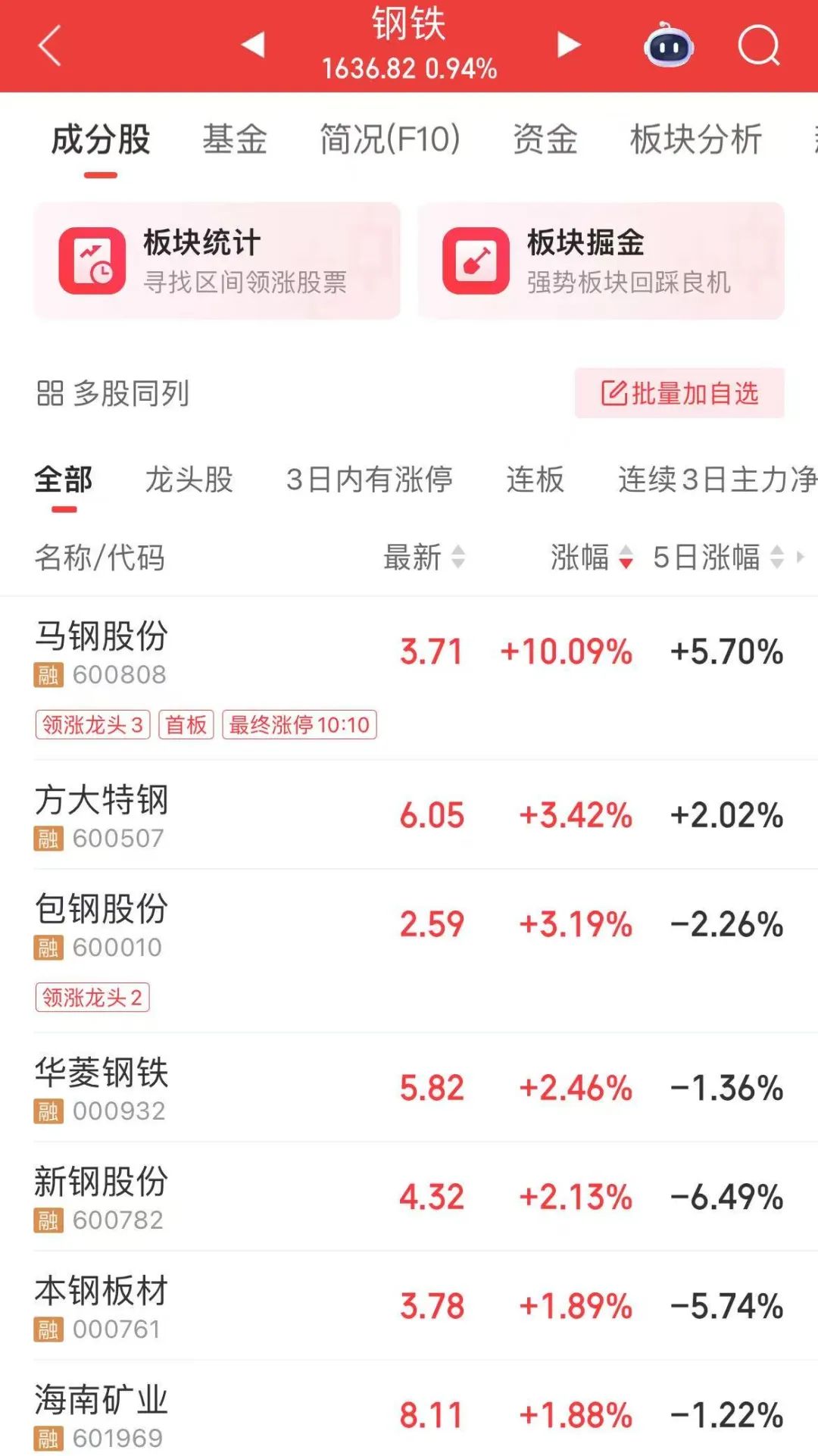 今天上午,A股钢铁板块异动拉升,马钢股份涨停。
