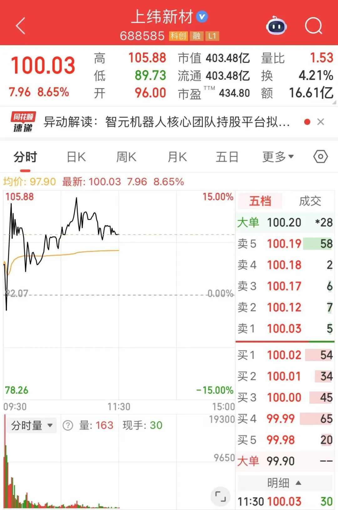 上纬新材今日复牌再度走强,上午上涨8.65%,股价突破百元,总市值为403.48亿元。上纬新材此前因股价异动,自7月31日开市起停牌。该股自7月初启动一波强势上涨行情,今年以来累计涨幅为1408.8%。
