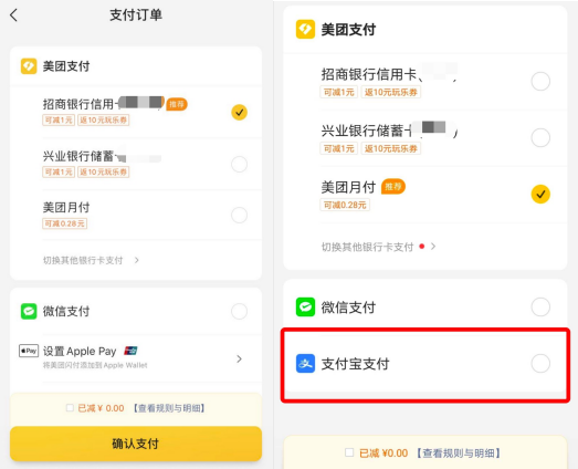 彼时,29日晚间,在美团点评上,证券时报·券商中国记者在选购产品进行支付环节发现,当前可供首选的是美团月付、其次是其他银行卡(需绑定),以及微信支付。不过,31日下午,记者在美团APP上选购支付环节时发现,其已恢复支持支付宝支付,只是系统默认的支付方式仍然是美团支付;不过,也有用户向记者反映,其支付页面,当然仍然只能使用美团支付和银行卡支付方式。