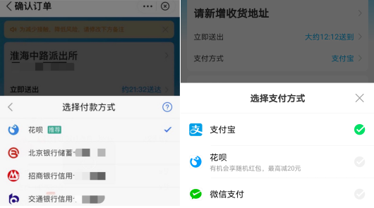 同时,美团金融服务平台旗下消费分期产品“美团月付”方面有侧面回应,认为此举是应对阿里旗下产品饿了么的支付页面显示只有支付宝、支付宝花呗和银行卡的支付方式。