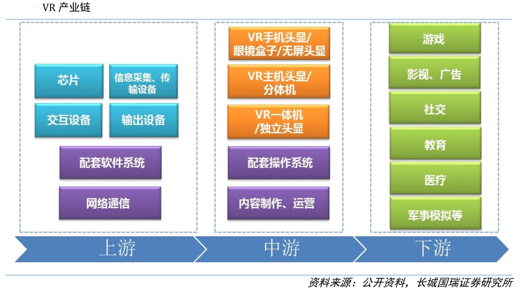 VR产业链与PC、手机产业链较为类似,可分为硬件、操作系统和开发平台,以及应用与内容等主要部分。
