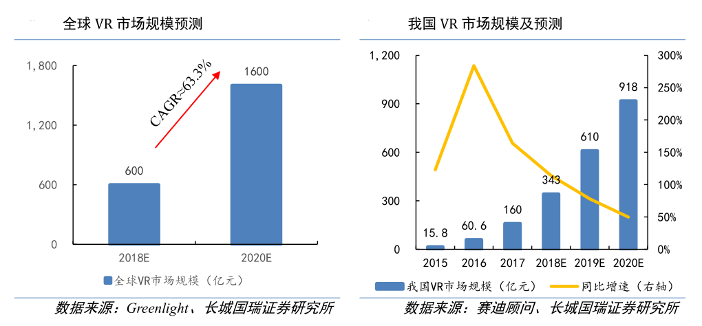 据Greenlight预测,2018年全球VR整体市场规模超过600亿元,预计2020年全球VR市场规模将达到1600亿元,期间复合增长率为63.3%;