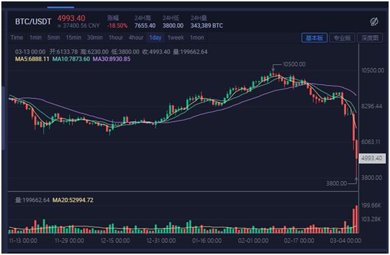 根据火币全球数据显示,比特币价格今日盘中跌破4000美元,最低探至3800美元,跌幅超43%,截至记者发稿,比特币价格报4993美元,跌幅达18.5%,这也是比特币自2019年3月以来首次跌破4000美元,比特币市值目前为942.46亿美元。