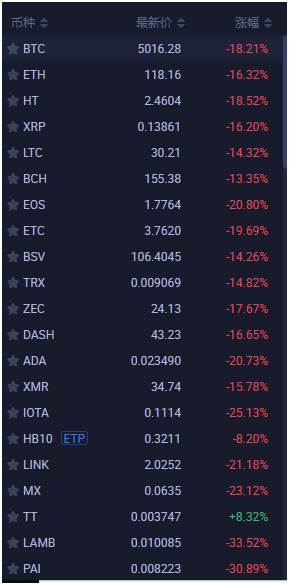 目前由于新冠病毒危机加剧,全球范围内风险资产遭到抛售。其他主流加密数字币同样出现大跌,以太坊继昨日跌幅高达31.05%之后,今日跌幅再次高达16.32%,报118.16美元,莱特币(LTC)继昨日跌幅32.49%,今日再大跌14.32%,报30.21美元,比特币现金(BCH)继昨日跌幅33.86%,今日再跌13.35%,报155.38美元。