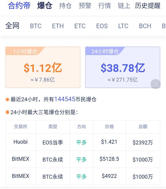截至记者发稿前的24小时交易数据中,最大三笔爆仓分别来自于火币和BitMEX交易所,BitMEX交易所合计爆仓14.67亿美元,OKex合约合计爆仓17.07亿美元,最为惨重,火币合约合计爆仓3.96亿美元,币安合约合计爆仓3.06亿美元。