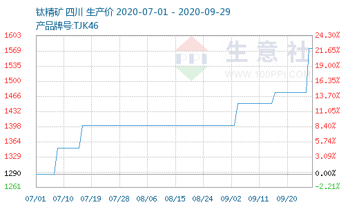 钛白粉价格上涨也助涨了上游钛精矿的价格,钛白粉省份产量四川仍占据榜首,当地钛白粉行业的行情基本可以体现全国的行业趋势。近期,攀西地区钛精矿主流价格明显上行,调涨幅度在100元/吨左右。攀西地区主要受天气和道路运输影响,交投市场钛中矿现货紧张。生意社数据显示,7月份至今,钛精矿价格涨幅超过20%,还有继续上涨的趋势。