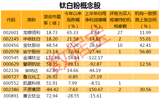 从机构观点来看,龙蟒佰利、宝钛股份更受青睐,分别有27家、10家机构将其评级为买入或增持。从机构一致预测的上涨空间来看,安宁股份、中核钛白的潜力更大,其一致预测上涨空间都超过了50%。