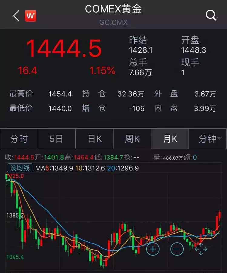 Wind数据显示,COMEX黄金自5月以来升势明显,并在18日一举攻破1450关口,创逾六年新高。