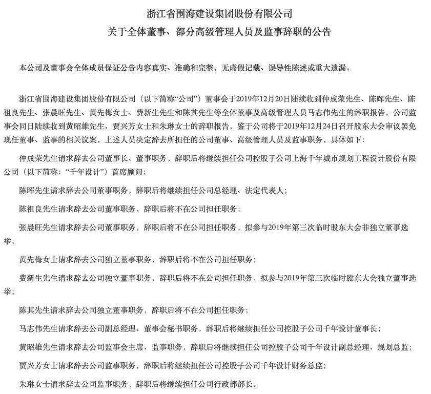 12月20日晚间,ST围海公告称公司董事会于当日陆续收到仲成荣、陈晖、陈祖良、张晨旺、黄先梅、费新生和陈其等全体董事,以及高级管理人员马志伟的辞职报告,公司监事会同日陆续收到黄昭雄、贾兴芳和朱琳的辞职报告。